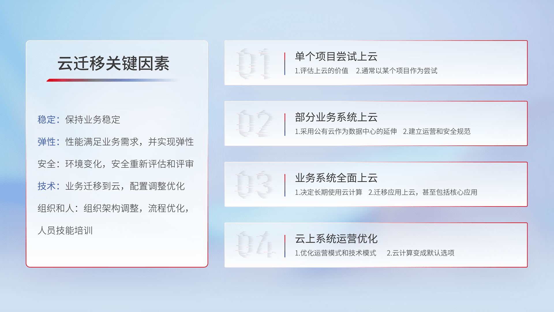 结合实际业务,,,从规划设计、、、云平台选型、、云原生改造、、、数据迁移、、、集成交付,,,,迁移全过程为客户识别最佳上云路径,,,,做好风险识别管理,,,设计网络架构、、、身份权限、、安全审计合规、、操作审计、、、日志审计、、、监控告警策略、、多站点容灾设计等,,,对云上基础设施进行整体规划,,提升IT治理水平,,以满足弹性、、高可用、、高性能的需求。。