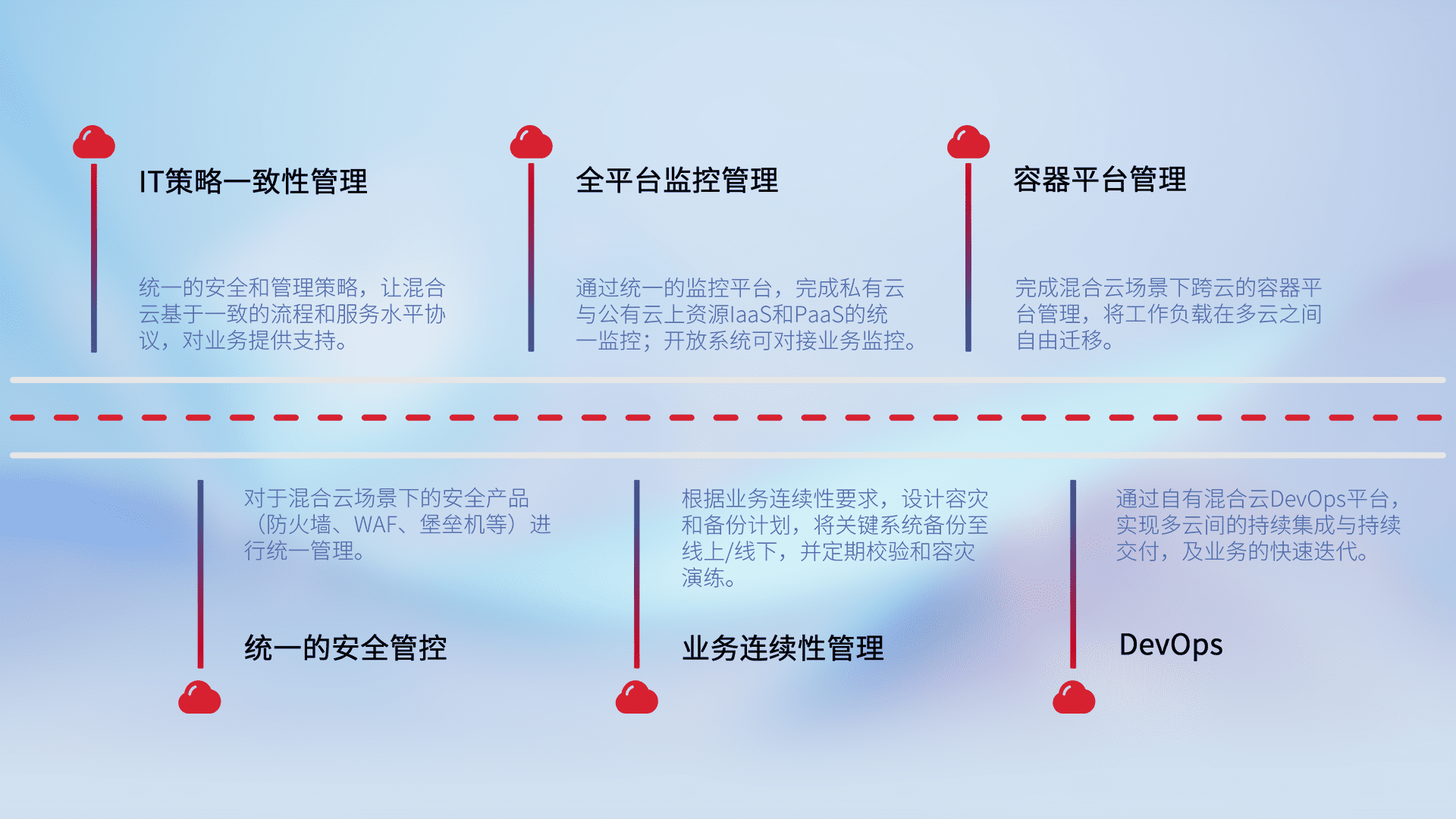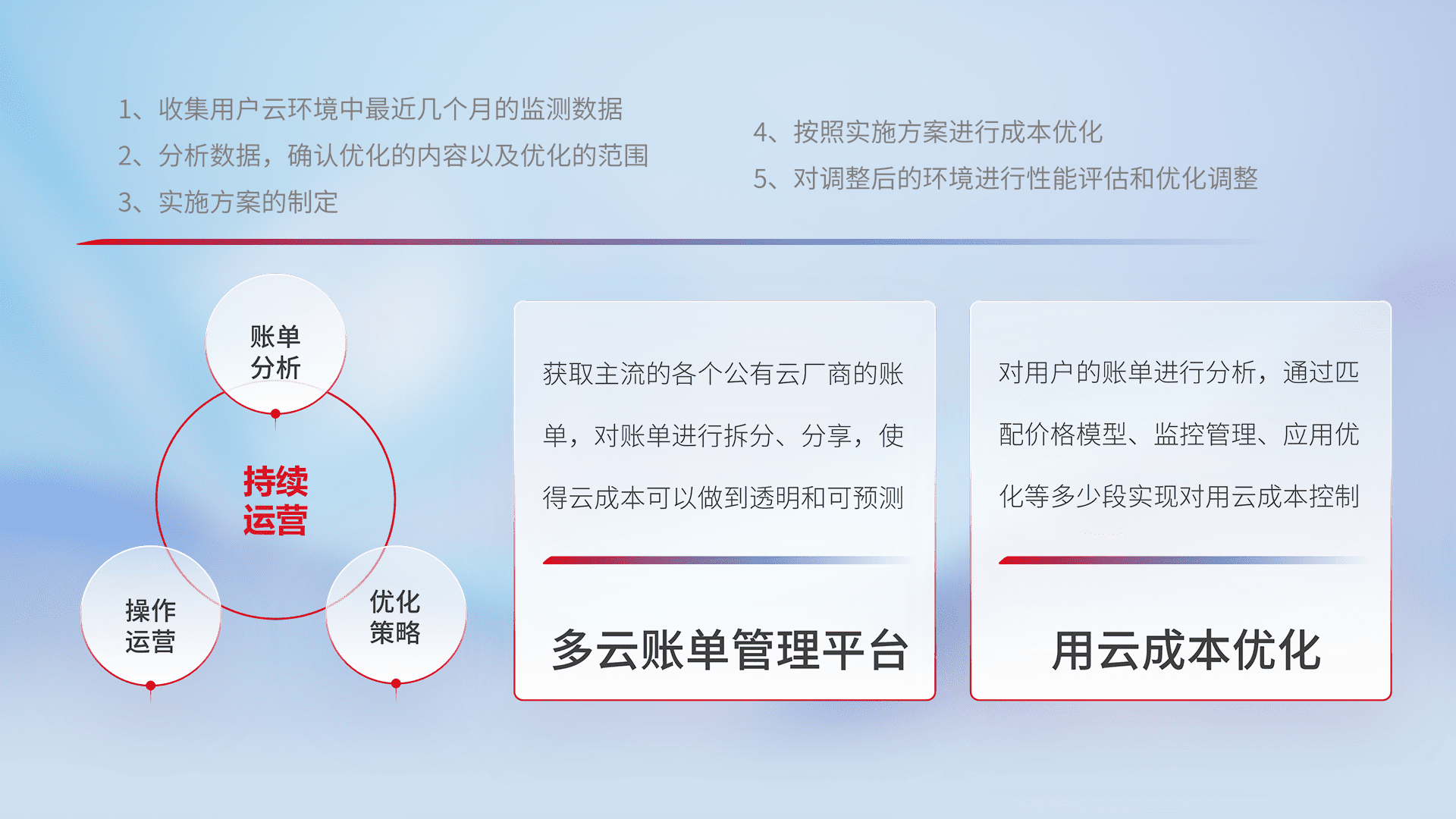 通过多云纳管,,,,以统一的资源数据模型把客户的云资源进行抽象和封装,,进而实现对多云资源的统一操作,,,,保障云资源管理的可靠性、、、稳定性与可用性。。。量身定制化运维内容,,,,配置、、开发运维、、、补丁管理、、备份、、、监控、、、认证和访问管理、、、、审计和日常巡检等,,保障在用云过程中的可靠度,,,,稳定度以及高可用率。。